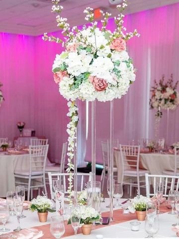 Price includes the stand and flowerball on top only, with your choice of accent color. Limited colors available. Some colors are seasonal therefore unavailable in large quantities. Unique requests of unstocked florals may be ordered by customer at customer's expense. Base color is white hydrangea to fill flowerball however other hydrangea colors may be used at customers expense. Silk Florals only. Pricing is per centerpiece.
