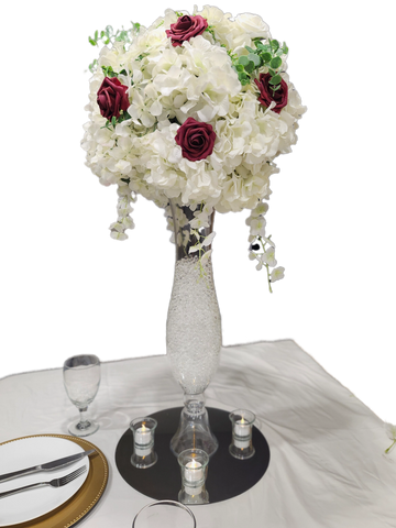 This vase with floating candle adds a romantic accent to the room, being coupled with the 30" centerpiece. It comes with the mirror underneath, diamonds inside, and a floating candle. Customer may choose to use large acrylic diamonds inside vase, greenery, or other beads for additional decor. Many bead color options are available. This product may not be rented without the centerpiece stand, at the same price. Please contact me for pricing in that instance. Price is per unit.