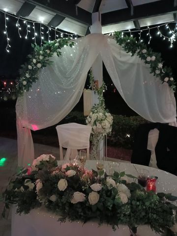 Arch comes with long sheer white drape and 2 florals as shown. 9 ft wide. Accent colors to match theme may be added at no additional expense. Limited delivery area. Delivery fee may apply depending upon location. Please message me for details.